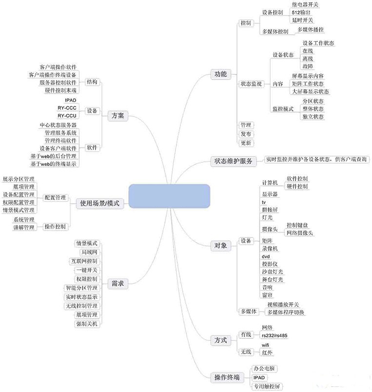 展廳中控系統(tǒng)(中央控制系統(tǒng)、ipad控制系統(tǒng))是對展廳內(nèi)的聲、光、電等各種設(shè)備進行集中控制的一套軟硬件相結(jié)合的系統(tǒng)。用戶可用移動式控制面板、計算機顯示器、觸摸屏或無線遙控等設(shè)備,通過計算機和中央控制系統(tǒng)軟件來控制投影機、展示臺、燈光、影碟機、錄像機、卡座、功放、話筒、計算機、筆記本、電動窗簾、電動屏幕等設(shè)備。